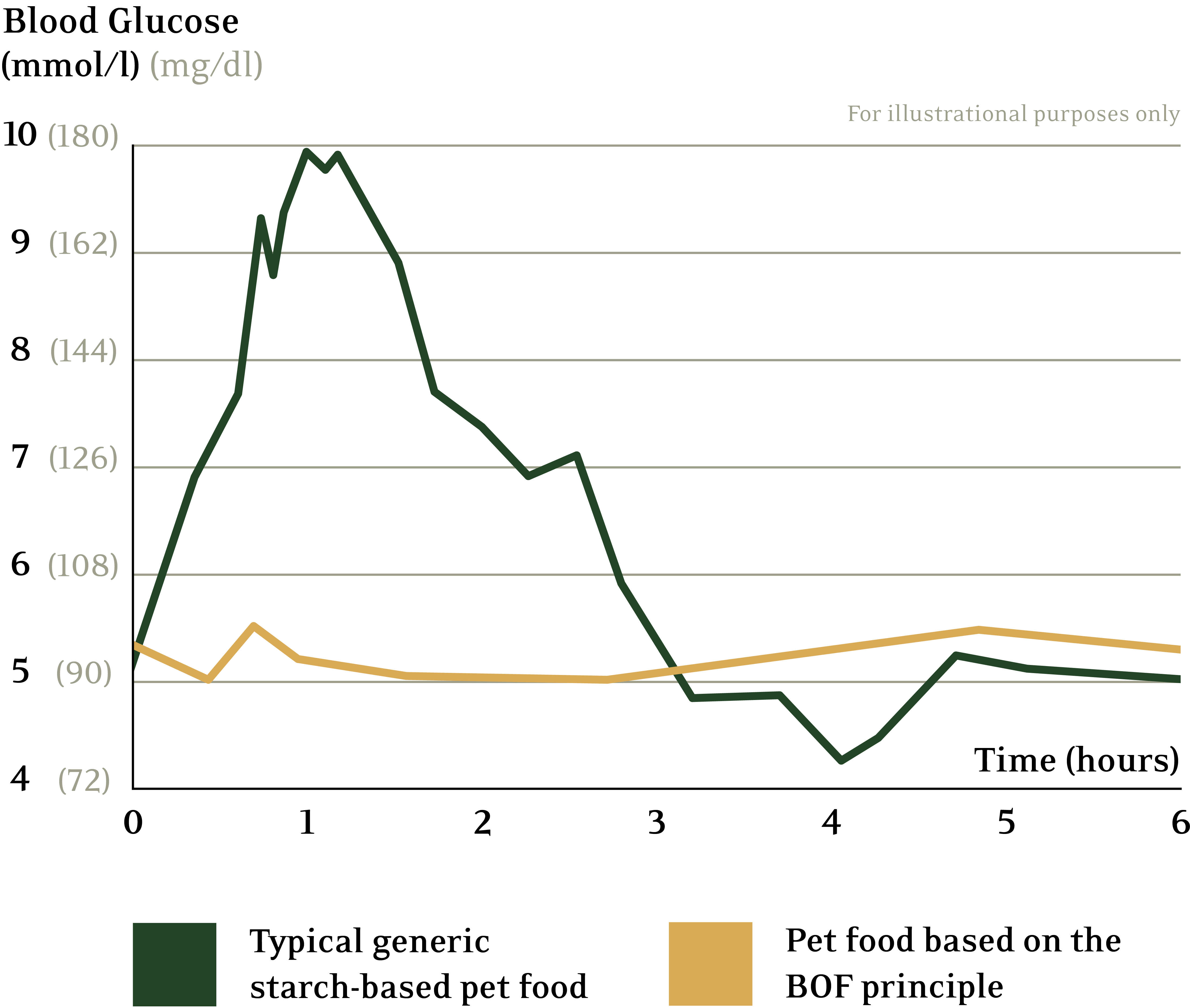 Illustration shows bloodsugar development with BOF based meals vs. other brands' premium petfood.